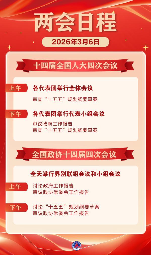 新華社北京3月5日電 6日上午,十四屆全國(guó)人大四次會(huì)議各代表團(tuán)舉行全體會(huì)議,審查“十五五”規(guī)劃綱要草案;下午各代表團(tuán)舉行代表小組會(huì)議,審議政府工作報(bào)告,審查“十五五”規(guī)劃綱要草案。