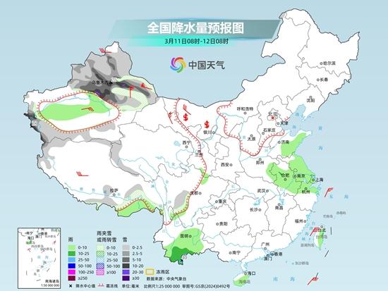 明天,內(nèi)蒙古中東部、黑龍江西北部、新疆沿天山地區(qū)和南疆山區(qū)、西藏西部和南部、青海北部和東部、甘肅東部、寧夏南部、陜西北部、華北北部、川西高原北部等地部分地區(qū)有小雪或雨夾雪,其中,新疆南疆盆地和南疆西部山區(qū)、青海西北部、甘肅河西等地部分地區(qū)有中到大雪,新疆南疆盆地和南疆西部山區(qū)等地局地暴雪。新疆南疆盆地、西藏東南部、西北地區(qū)東南部、西南地區(qū)東部和南部等地部分地區(qū)有小到中雨,其中,云南西南部等地部分地區(qū)有大雨。
