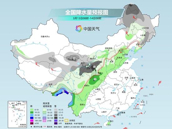 后天,內(nèi)蒙古東部、東北地區(qū)大部、新疆南疆南部、西藏東部、西北地區(qū)中東部、華北西部、西南地區(qū)北部等地部分地區(qū)有小到中雪或雨夾雪,其中,內(nèi)蒙古東北部、黑龍江西北部、青海北部和東部、甘肅中東部、寧夏中南部、陜西北部等地部分地區(qū)有大到暴雪。西藏東南部、陜西南部、四川盆地北部、云南西部等地部分地區(qū)有中到大雨,其中,西藏東南部等地部分地區(qū)有暴雨。