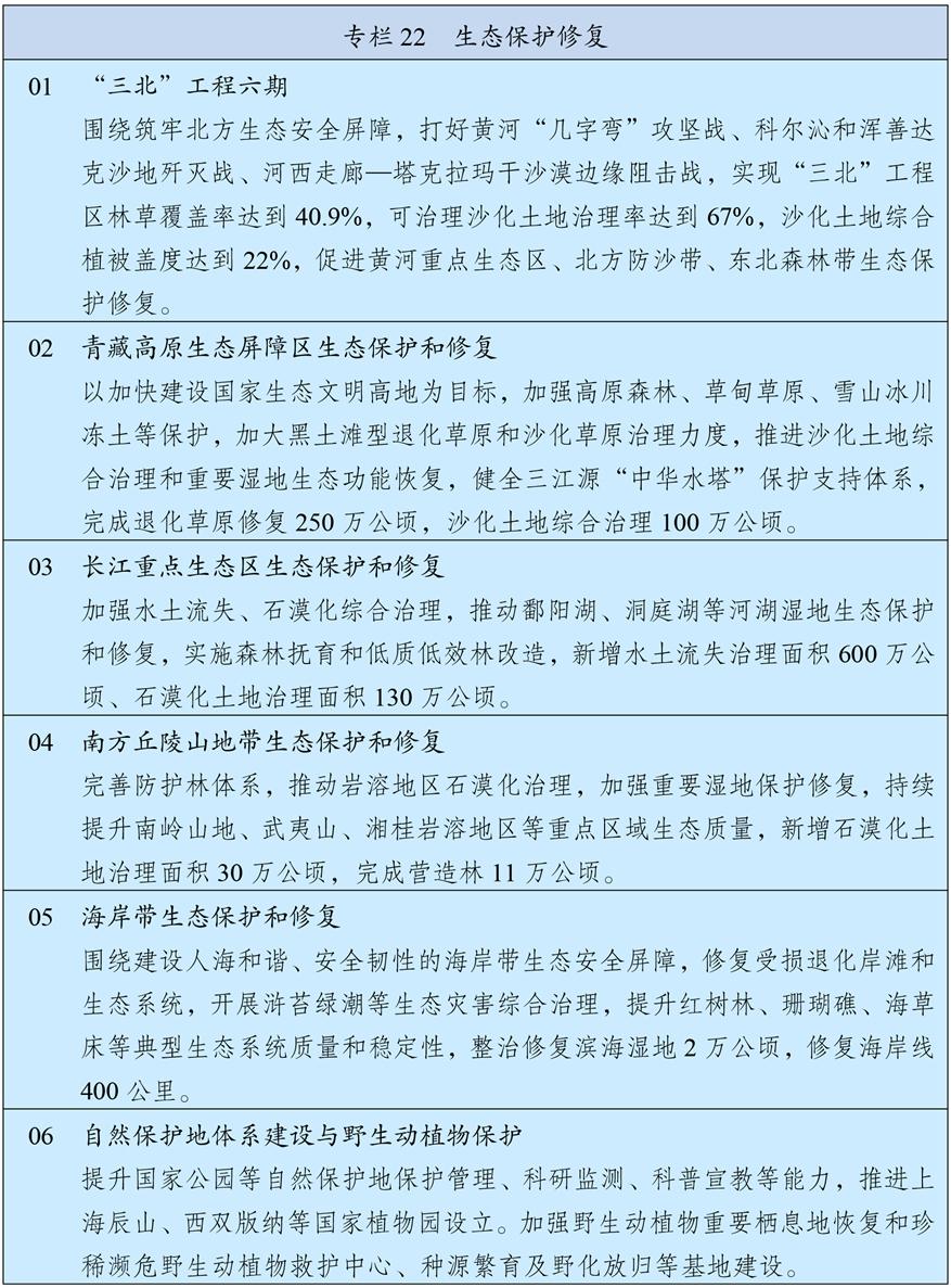 統(tǒng)籌推進重要生態(tài)系統(tǒng)保護和修復(fù)重大工程,持續(xù)鞏固以“三區(qū)四帶”為骨架的國家生態(tài)安全屏障體系。打好“三北”工程攻堅戰(zhàn),推動三大標(biāo)志性戰(zhàn)役取得決定性勝利。深入推進青藏高原生態(tài)保護,加強重點區(qū)域水土流失治理和石漠化治理。科學(xué)開展大規(guī)模國土綠化行動,推進森林質(zhì)量精準(zhǔn)提升和國家儲備林建設(shè),森林蓄積量達(dá)到224億立方米,統(tǒng)籌草原生態(tài)修復(fù)與合理利用,加強濕地保護修復(fù)。推進超引地表水和超采地下水治理,開展歷史遺留廢棄礦山生態(tài)修復(fù)。