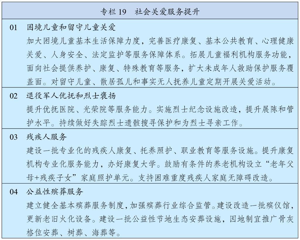 深化退役軍人管理保障改革,完善組織管理、工作運行和政策制度體系。健全優(yōu)撫待遇確定和調(diào)整機制,加強優(yōu)待項目統(tǒng)籌管理,完善退役軍人幫扶援助和法律服務(wù)體系。深化優(yōu)撫醫(yī)院、光榮院管理改革,完善優(yōu)撫醫(yī)療康養(yǎng)體系。推進退役軍人高質(zhì)量安置就業(yè),完善安置辦法,強化政策支持和服務(wù)指導(dǎo)。健全退役軍人榮譽激勵和表彰獎勵制度。加強和改進雙擁模范創(chuàng)建工作。大力弘揚英烈精神。
