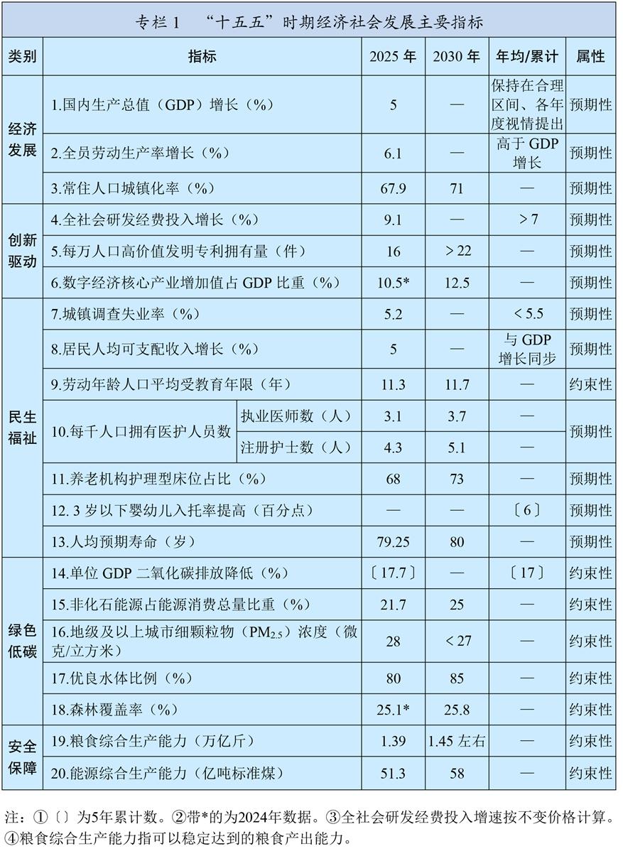 新發(fā)展理念引領(lǐng)作用全面彰顯,構(gòu)建新發(fā)展格局邁出重要步伐,新質(zhì)生產(chǎn)力穩(wěn)步發(fā)展,高質(zhì)量發(fā)展扎實推進。經(jīng)濟運行穩(wěn)中有進,國內(nèi)生產(chǎn)總值突破140萬億元,現(xiàn)代化產(chǎn)業(yè)體系建設(shè)取得重大進展,基礎(chǔ)設(shè)施支撐能力不斷提升,數(shù)字經(jīng)濟核心產(chǎn)業(yè)增加值占比超過10.5%,城鄉(xiāng)區(qū)域發(fā)展平衡性協(xié)調(diào)性增強。科技創(chuàng)新成果豐碩,全社會研發(fā)經(jīng)費投入強度達(dá)到2.8%,攻克一批重大關(guān)鍵核心技術(shù),取得一批重大原創(chuàng)科技成果。全面深化改革進一步推進,落實“兩個毫不動搖”的體制機制不斷完善,全國統(tǒng)一大市場建設(shè)取得積極成效,宏觀經(jīng)濟治理效能進一步提升。高水平對外開放不斷擴大,開放型經(jīng)濟新體制加快形成,高質(zhì)量共建“一帶一路”走深走實。全過程人民民主深入發(fā)展,全面依法治國有效實施。文化事業(yè)和文化產(chǎn)業(yè)蓬勃發(fā)展,精神文化產(chǎn)品豐富多彩。民生保障扎實穩(wěn)固,居民人均可支配收入年均增長5.4%,城鎮(zhèn)新增就業(yè)累計達(dá)到6242萬人,勞動年齡人口平均受教育年限達(dá)到11.3年,人均預(yù)期壽命提升至79歲以上,脫貧攻堅成果鞏固拓展。綠色低碳轉(zhuǎn)型步伐加快,生態(tài)環(huán)境質(zhì)量持續(xù)改善,非化石能源發(fā)電裝機容量超過化石能源,地級及以上城市細(xì)顆粒物(PM2.5)濃度降至28微克/立方米,地表水達(dá)到或好于Ⅲ類水體比例超過90%,森林覆蓋率超過25%。國家安全能力有效提升,糧食產(chǎn)量邁上1.4萬億斤大臺階,社會治理效能增強,社會大局保持穩(wěn)定。國防和軍隊建設(shè)取得重大進展。“一國兩制”實踐深入推進。中國特色大國外交全面拓展。全面從嚴(yán)治黨成效顯著,反腐敗斗爭縱深推進,黨的創(chuàng)造力、凝聚力、戰(zhàn)斗力明顯提高。