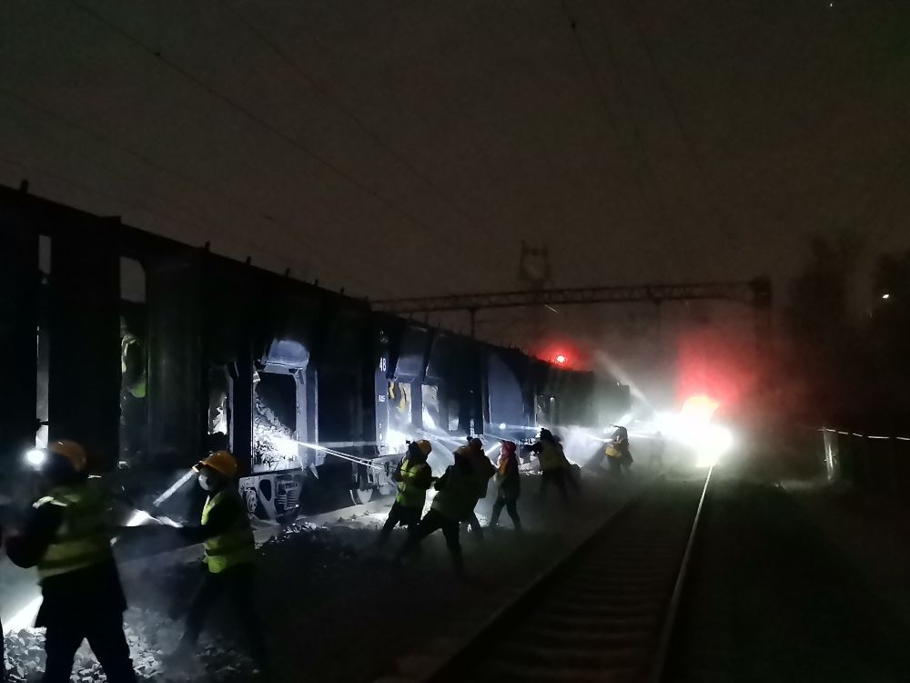 午夜時(shí)分,卸砟的命令下達(dá),一輛內(nèi)燃機(jī)車牽引著6節(jié)敞車抵達(dá)待卸地點(diǎn),隨著一個個一米大小的“側(cè)窗”開啟,石砟宛如“瀑布”傾瀉而下。
