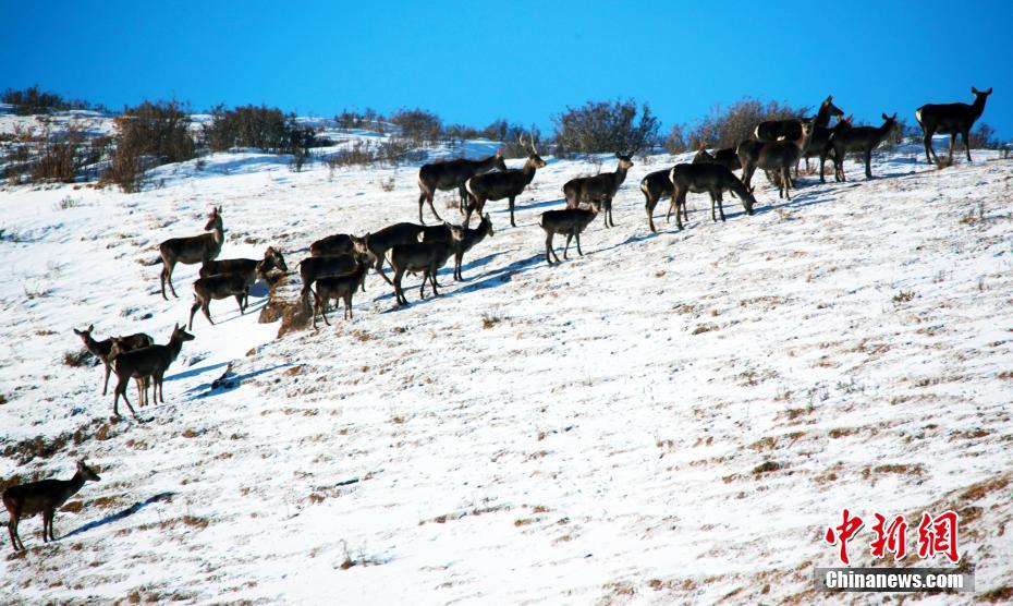 圖為馬鹿、狍鹿在覆雪的草原上成群出游。牛繼榮 攝