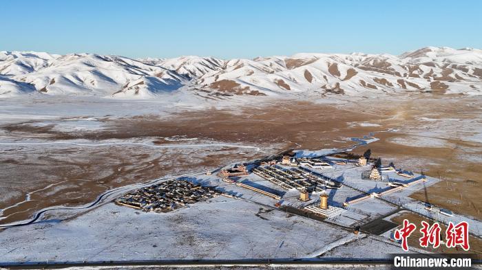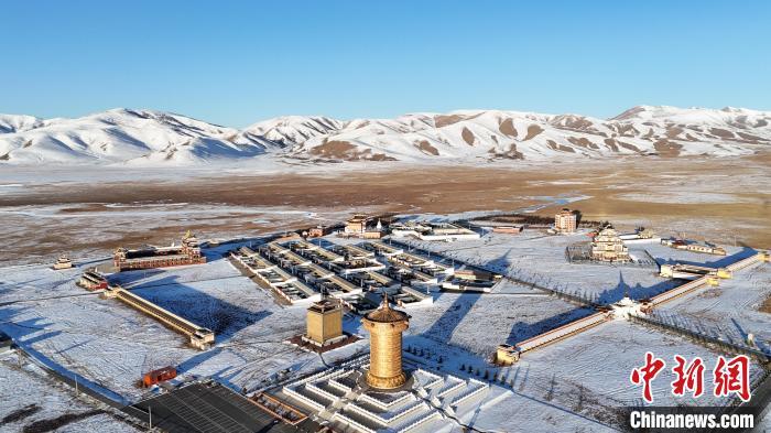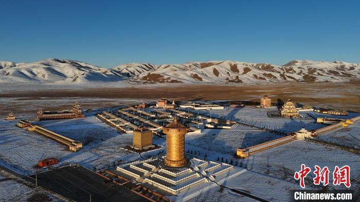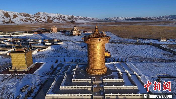 圖為阿萬倉鎮(zhèn)寧瑪寺大經(jīng)筒與周圍的白雪形成了鮮明的對比。(無人機照片)中新社記者 九美旦增 攝
