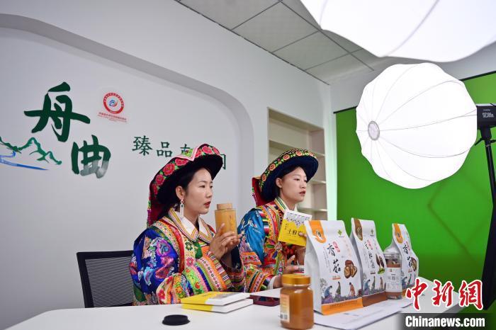 圖為舟曲縣電子商務(wù)直播中心工作人員直播銷售當(dāng)?shù)胤洚a(chǎn)品。中新社記者 九美旦增 攝