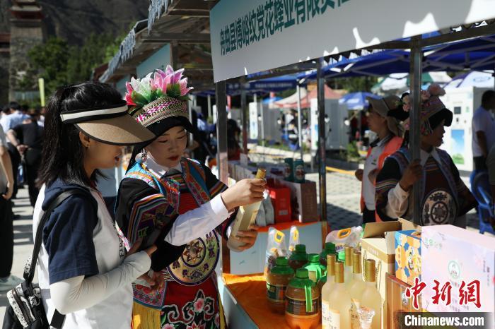 圖為工作人員向嘉賓介紹當(dāng)?shù)貎?yōu)質(zhì)蜂產(chǎn)品。中新社記者 九美旦增 攝