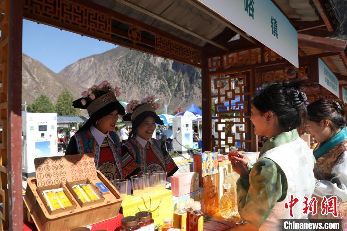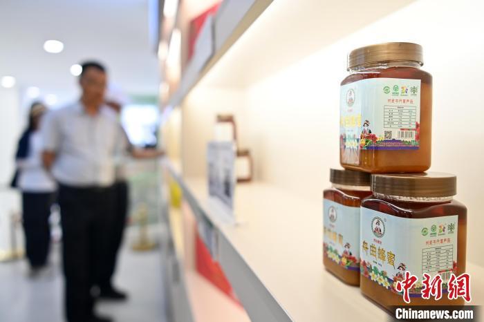 圖為活動現(xiàn)場的優(yōu)質(zhì)蜂產(chǎn)品展銷區(qū)。中新社記者 九美旦增 攝