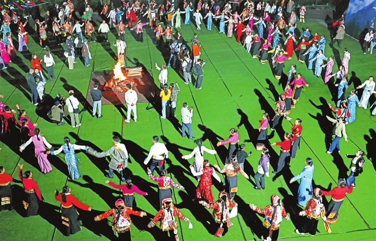 “簪花之路”沿線的鍋莊舞表演吸引眾多游人參與。
