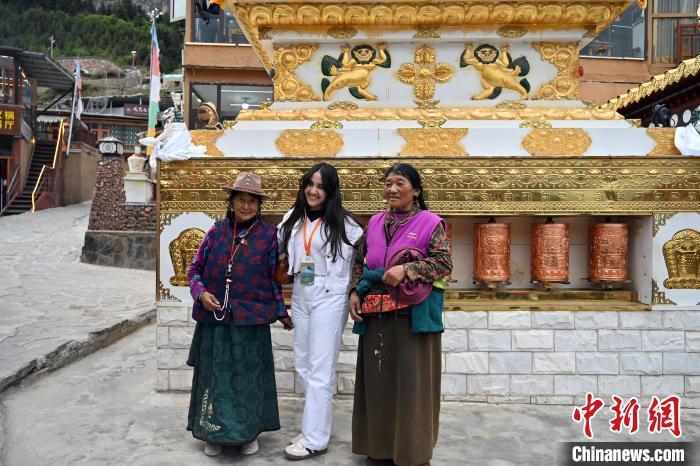 6月11日,甘肅迭部縣扎尕那村,迪拜中阿衛(wèi)視主持人阿思瑪(中)與當(dāng)?shù)鼐用窈嫌啊>琶赖┰?攝