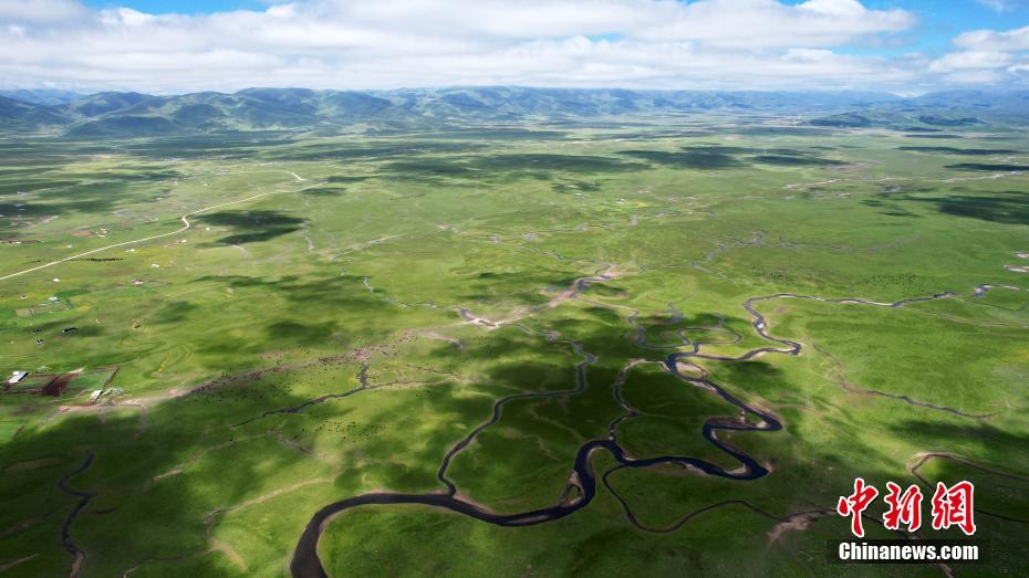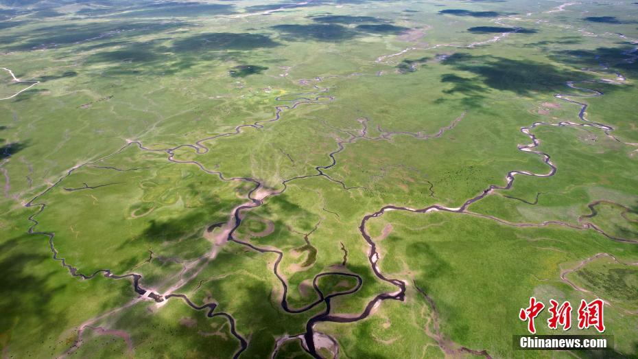7月12日,瑪曲縣阿萬倉濕地風(fēng)景如畫。(無人機照片)中新社記者 九美旦增 攝
