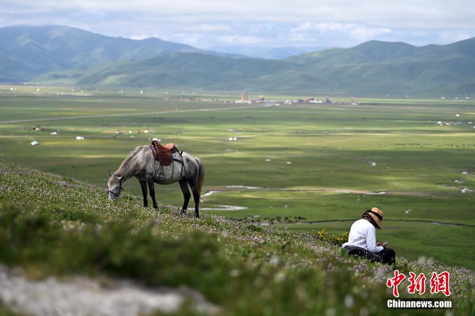 7月12日,游客在瑪曲縣阿萬倉濕地游覽。中新社記者 九美旦增 攝