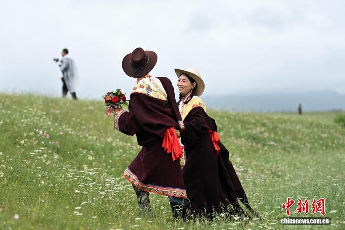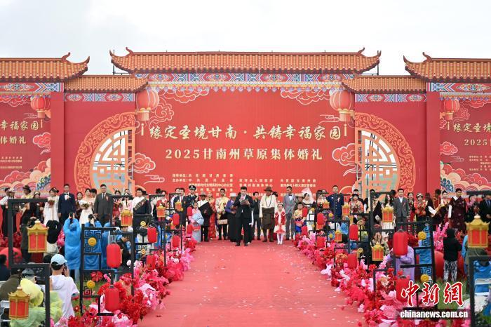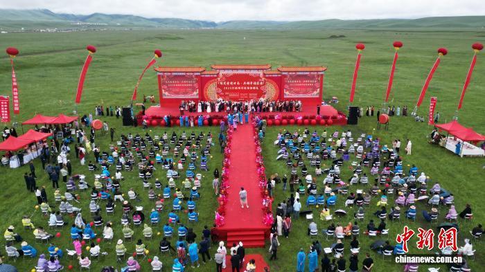 7月25日,“緣定圣境甘南·共鑄幸福家園”2025甘南州草原集體婚禮在甘肅省甘南藏族自治州夏河縣桑科草原舉行,來自天津、寧夏、甘肅等地的數(shù)十對新人,穿著各自民族的結(jié)婚服飾,在草原上感受草原婚禮的獨特魅力。