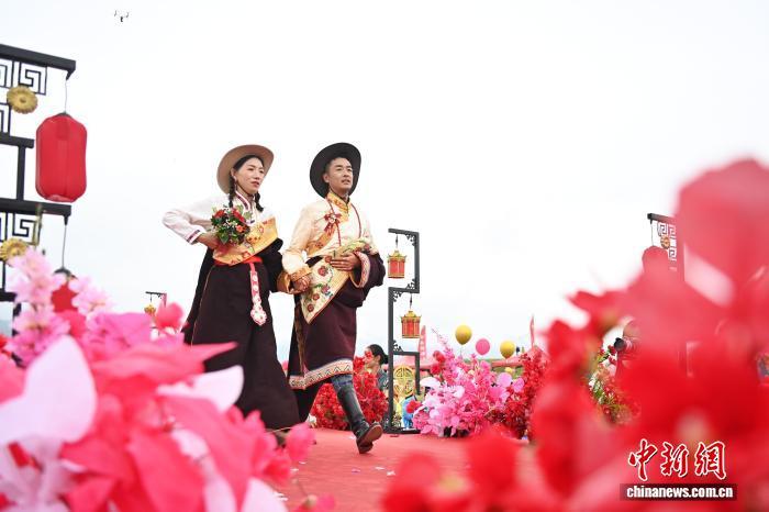 圖為活動現(xiàn)場的藏式迎親。中新社記者 九美旦增 攝