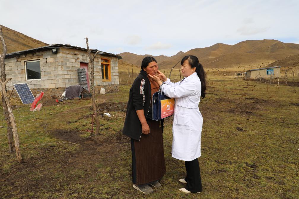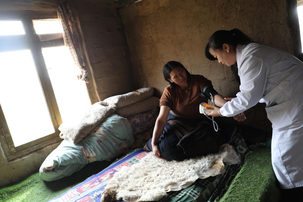 王蔣艷為牧民索南草測(cè)量血壓。新華社記者 梁軍 攝