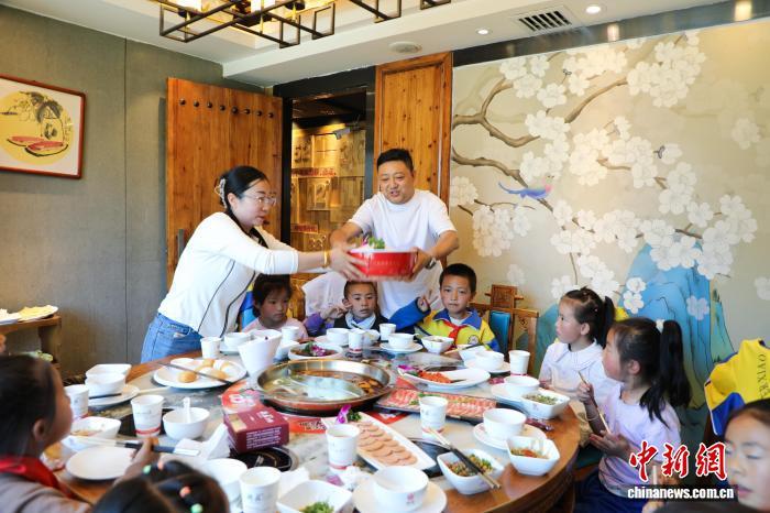 圖為2025年為慶?!傲弧眹?guó)際兒童節(jié),劉小成(中間白衣短袖)請(qǐng)甘南州合作市200位小朋友吃火鍋。(資料圖)受訪者供圖