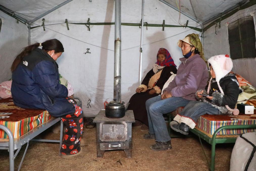 1月26日晚,在甘南州迭部縣電尕鎮(zhèn)哇曲村臨時安置點,群眾在應(yīng)急帳篷內(nèi)取暖休息?!⌒氯A社記者 張智敏 攝)