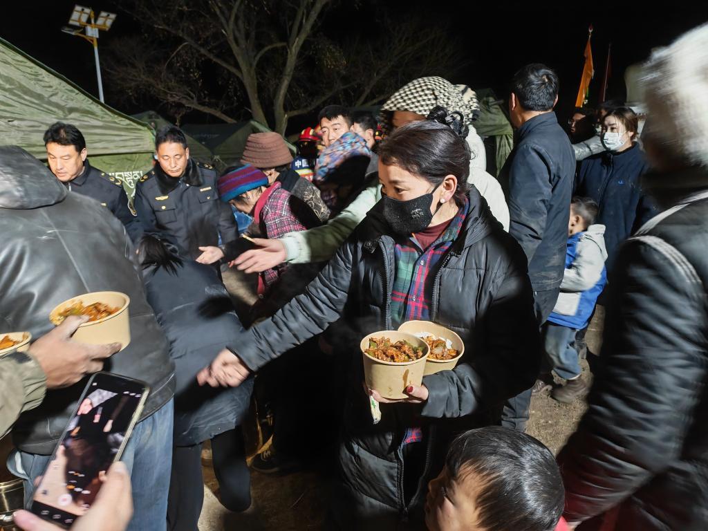 1月26日晚,在甘南州迭部縣電尕鎮(zhèn)哇曲村臨時安置點,群眾正在領(lǐng)取愛心餐食。新華社記者 崔翰超 攝