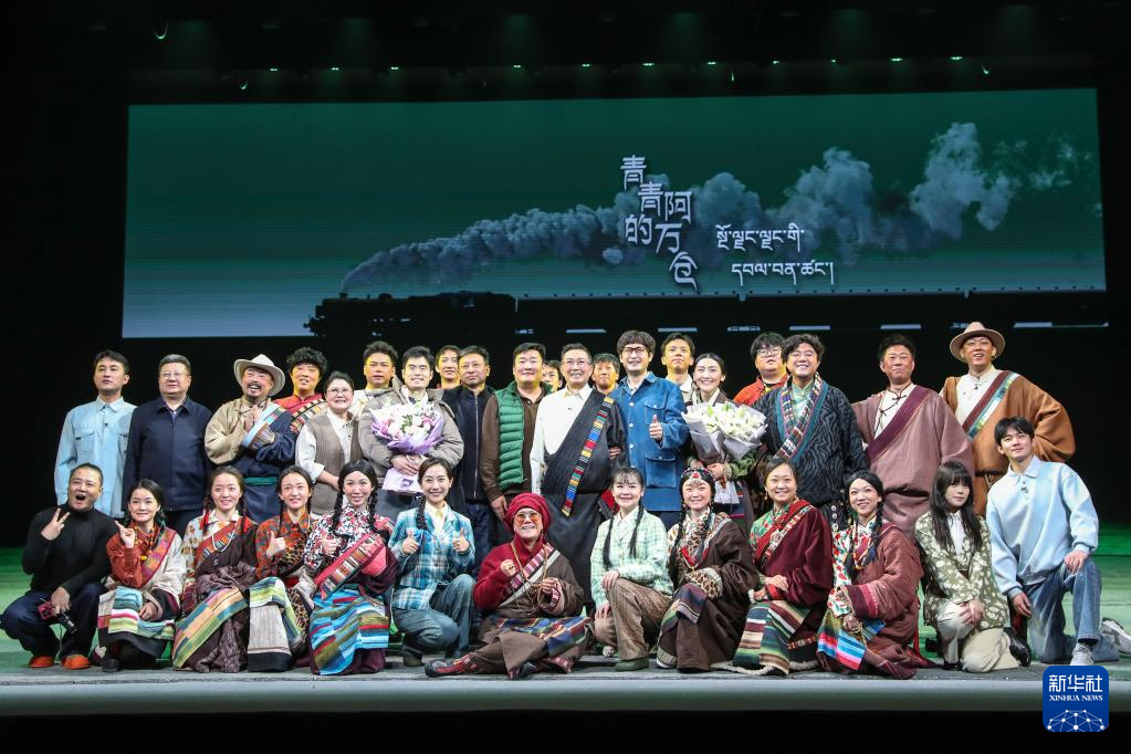 1月28日晚,在甘肅黃河劇院,演職人員在話劇《青青的阿萬倉》演出結(jié)束后合影。新華社記者 郎兵兵 攝