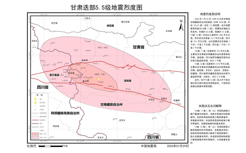 2026年1月26日14時(shí)56分,在甘肅省甘南州迭部縣發(fā)生5.5級(jí)地震。地震發(fā)生后,中國(guó)地震局派出地震現(xiàn)場(chǎng)工作隊(duì),依照《地震現(xiàn)場(chǎng)工作:調(diào)查規(guī)范》(GB/T 18208.3-2011)、《中國(guó)地震烈度表》(GB/T 17742-2020)、《地震烈度現(xiàn)場(chǎng)評(píng)定》(DB/T 107-2025),對(duì)災(zāi)區(qū)141個(gè)調(diào)查點(diǎn)展開(kāi)了實(shí)地震害調(diào)查,并充分參考震區(qū)斷裂構(gòu)造、儀器烈度、余震分布、震源機(jī)制等科技支撐成果,確定了此次地震的烈度分布,完成了《甘肅迭部5.5級(jí)地震烈度圖》編制工作,現(xiàn)正式向社會(huì)發(fā)布。