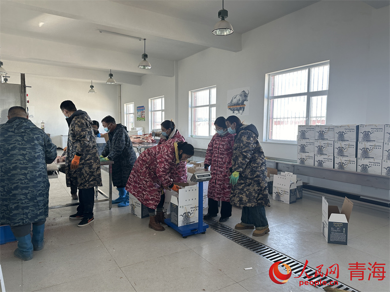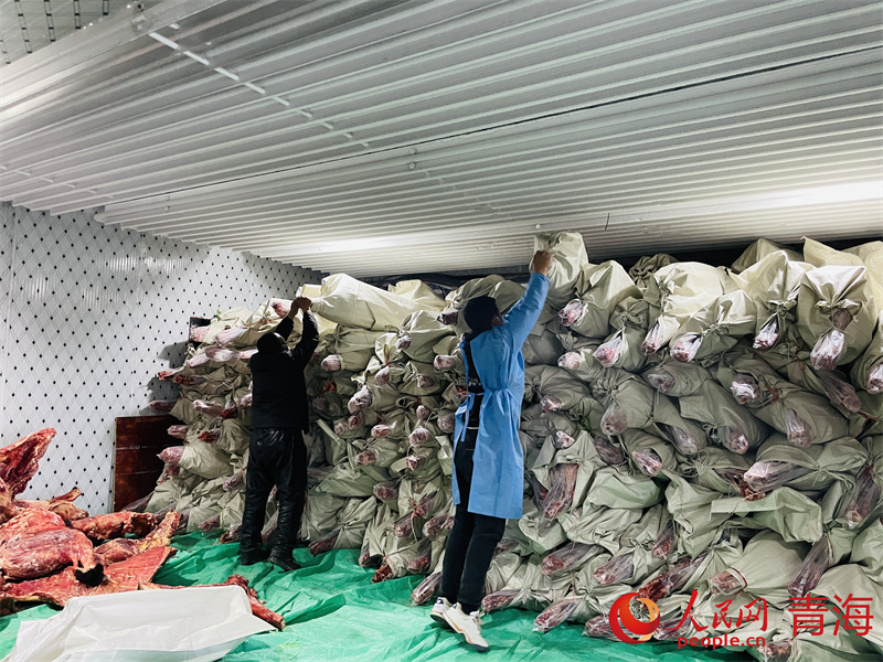 在崗尖蕃巴有限公司,崗措和仁措兩口子從冷庫里搬運著牛羊肉,稱重、分揀、打包、發(fā)貨。