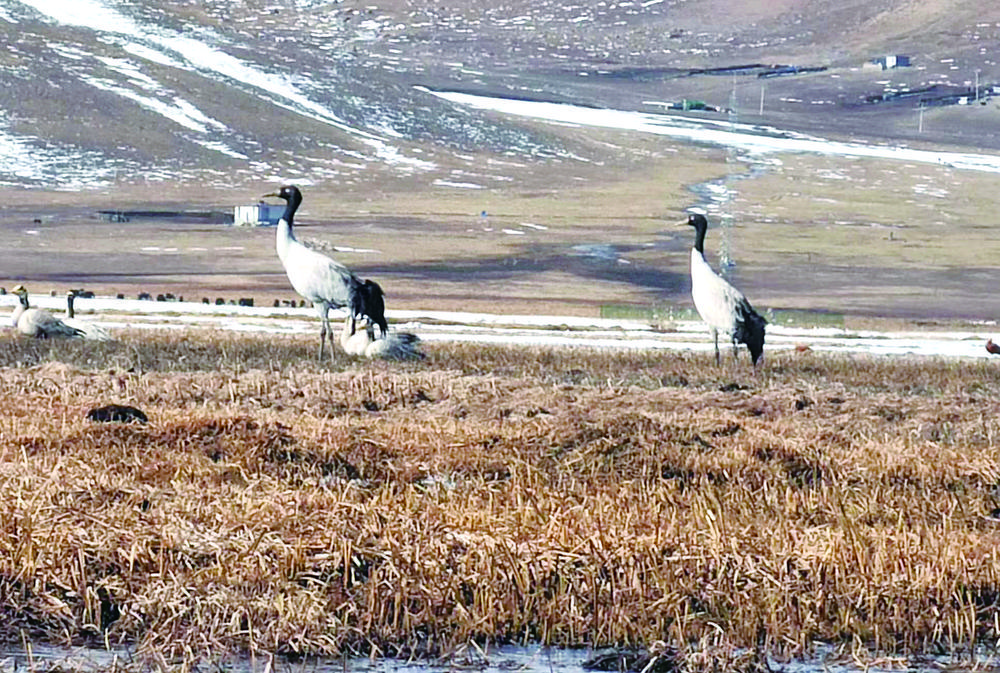 遠(yuǎn)眺黑頸鶴。
