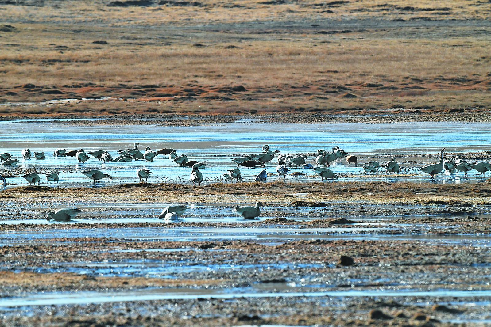 黃河源園區(qū)沼澤中覓食的斑頭雁。