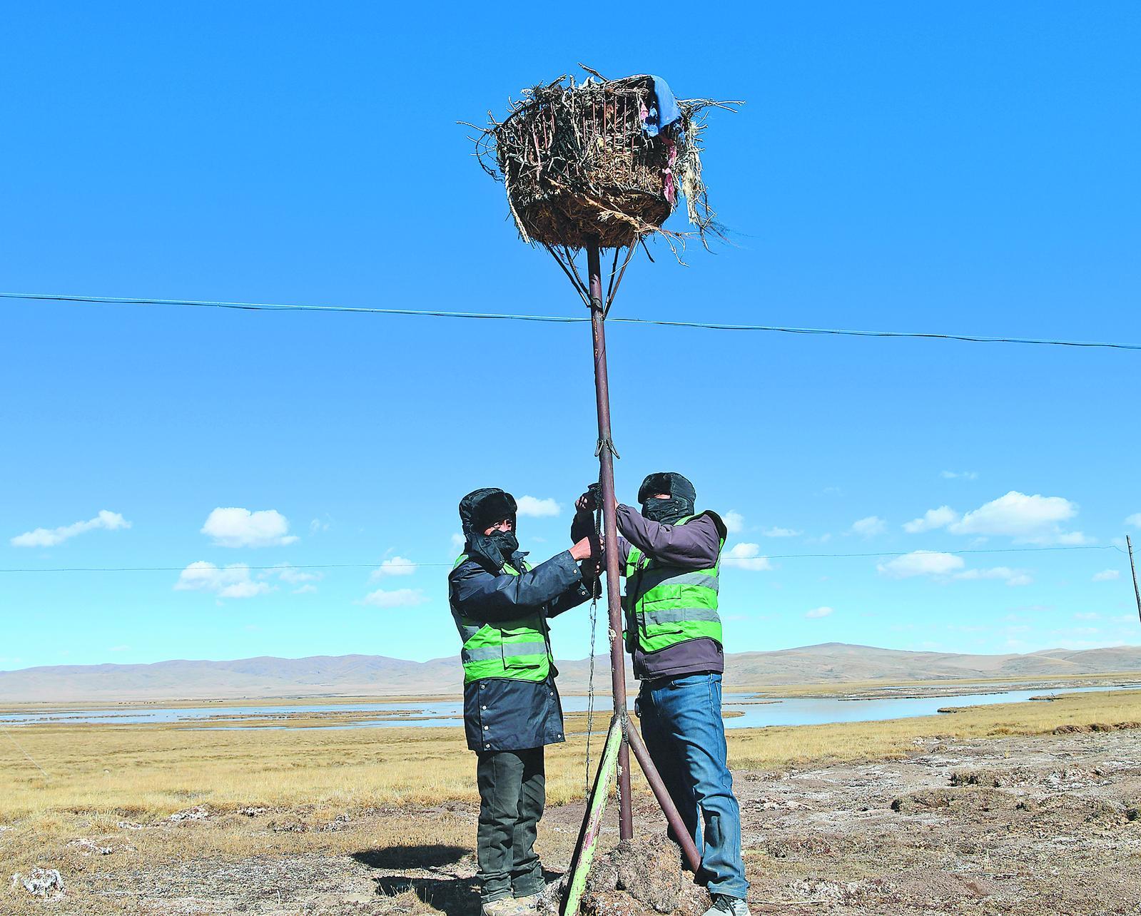 黃河源園區(qū)生態(tài)管護(hù)員搭建招鷹架。