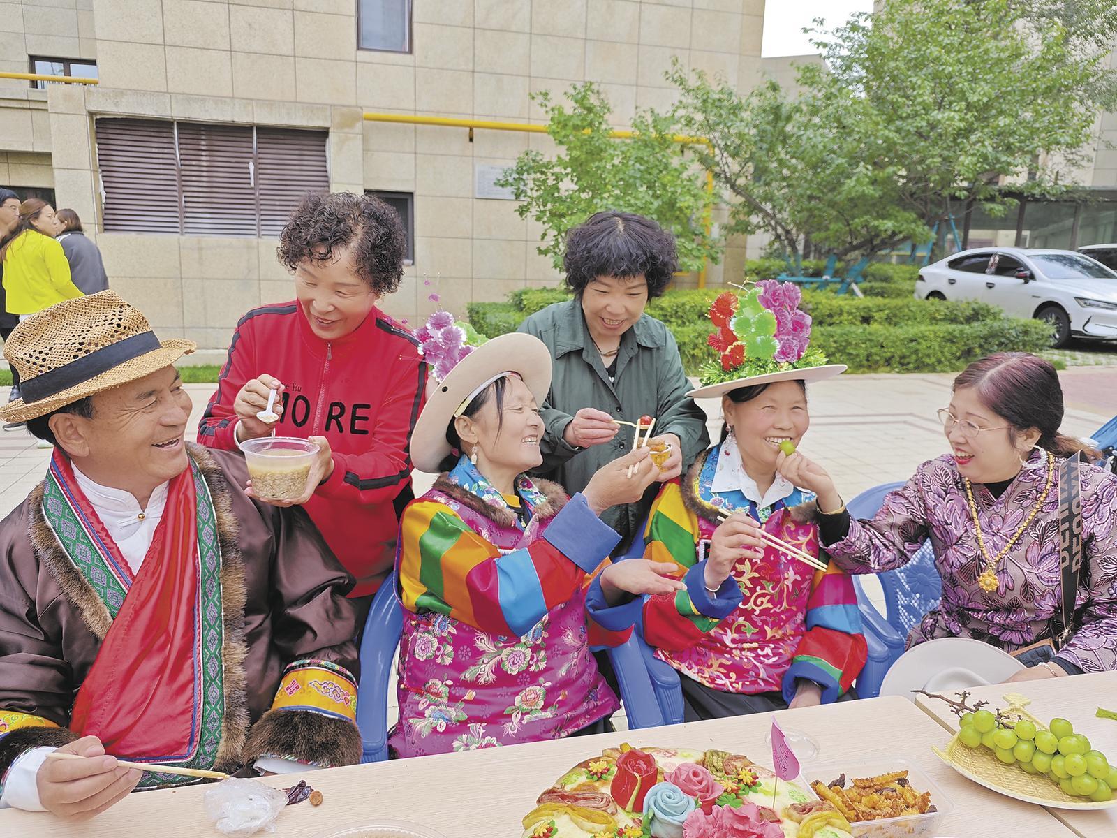 60多位來自漢族、藏族、撒拉族等不同民族的群眾身著特色民族服飾歡聚一堂,大家紛紛端來熱氣騰騰的拿手好菜。不一會兒,色香味俱全的佳肴就擺滿了一張張長桌。蒙古族居民布音達萊端起一盤散發(fā)著濃濃奶香味的草原傳統(tǒng)美食奶皮子,熱情邀請一旁的藏族居民扎西太品嘗?!昂贸?,好吃?!痹魈穱L后,豎起大拇指贊不絕口。