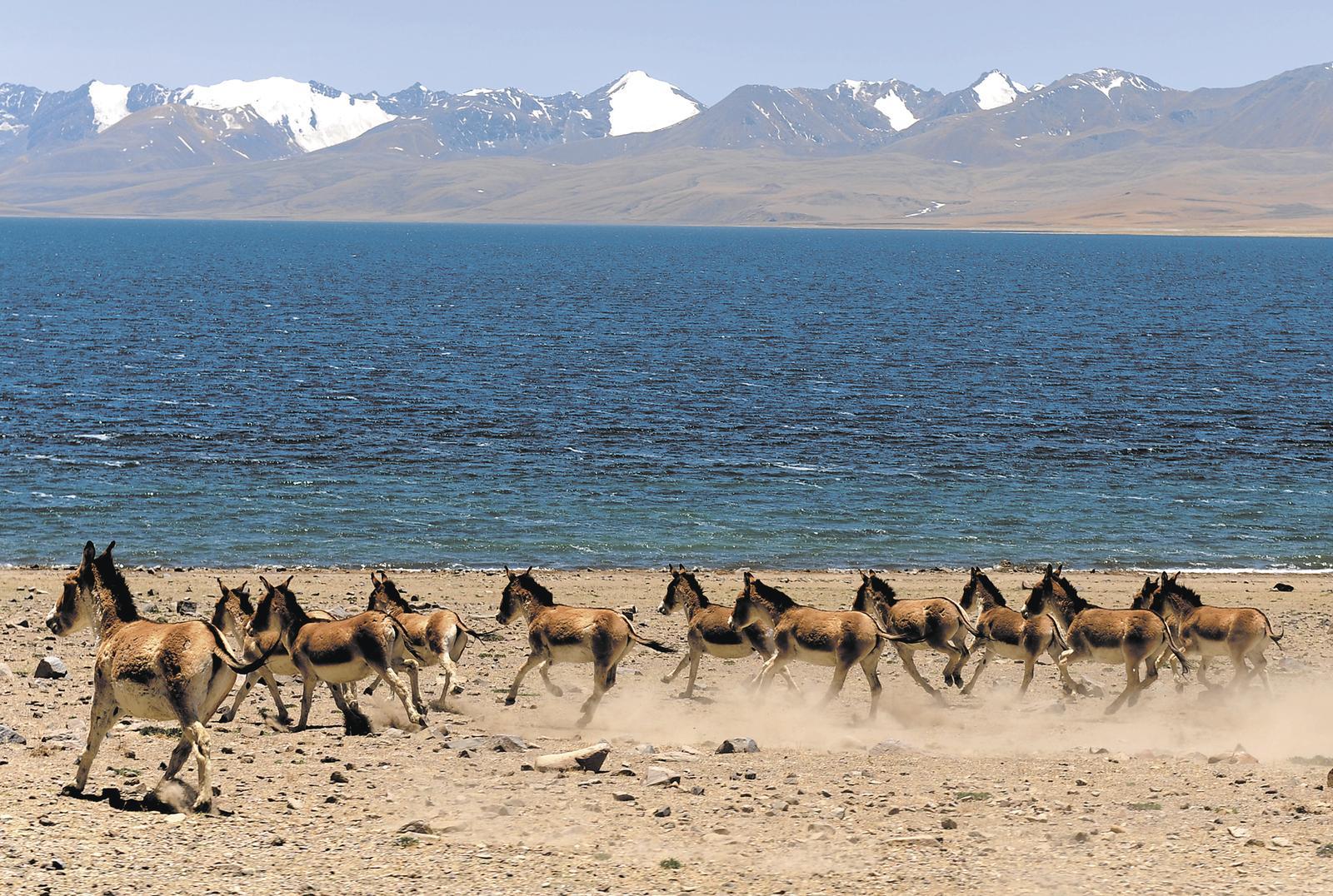 阿里措勤縣打加錯(cuò)湖邊奔跑的藏野驢。西藏日?qǐng)?bào)記者 李洲 攝