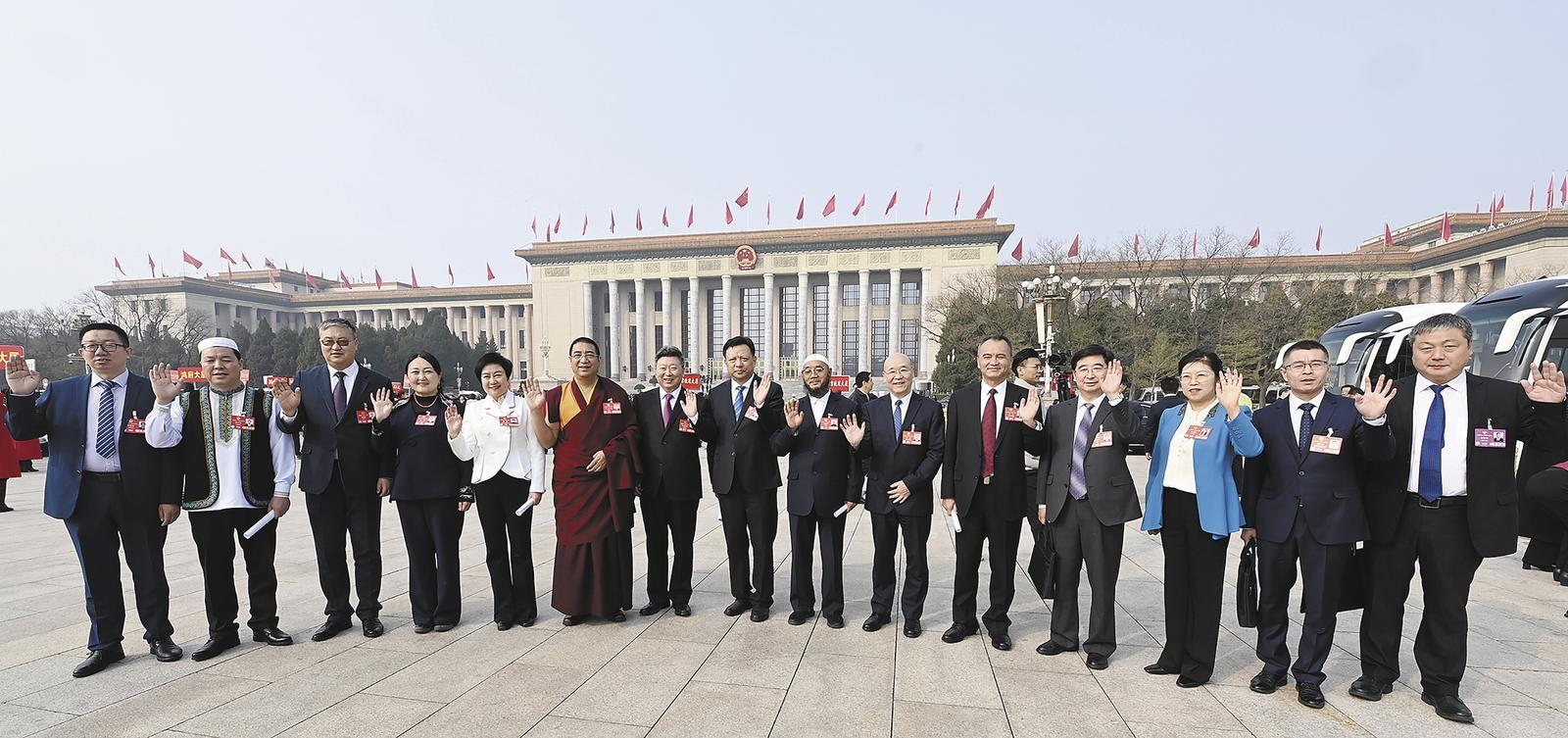 3月10日上午,全國(guó)政協(xié)十四屆三次會(huì)議閉幕。圖為住青全國(guó)政協(xié)委員在人民大會(huì)堂前合影留念。記者 祁國(guó)彪 攝