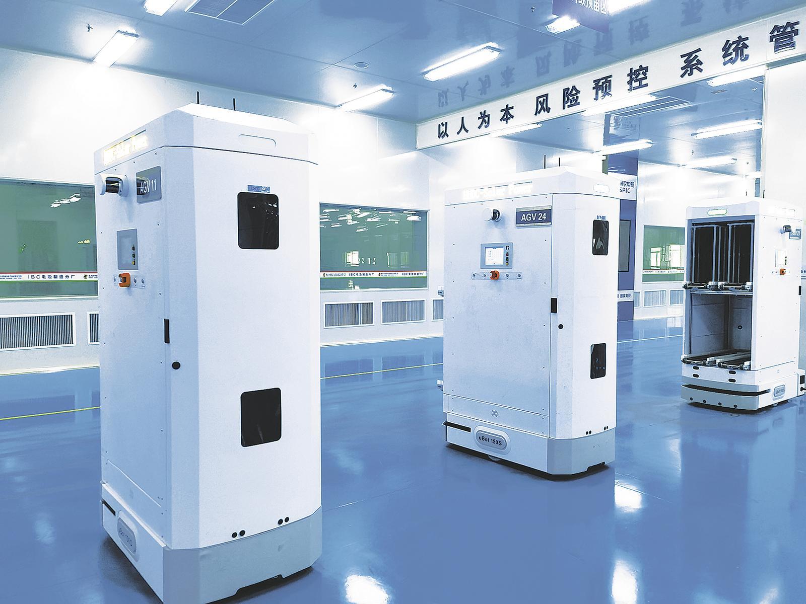 黃河公司IBC電池制造車間內(nèi)的運(yùn)輸機(jī)器人。記者 宋翠茹 攝