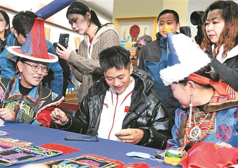在海西州非遺傳承基地,奧運健兒謝震業(yè)跟著繡娘學(xué)習(xí)青繡技藝。記者 李慶玲 攝