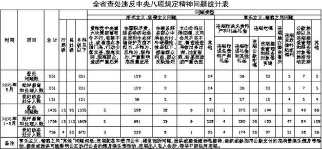 為持續(xù)加固中央八項(xiàng)規(guī)定堤壩,以嚴(yán)的基調(diào)、嚴(yán)的措施、嚴(yán)的氛圍深入推進(jìn)作風(fēng)建設(shè)常態(tài)化長(zhǎng)效化,現(xiàn)將2025年8月全省查處違反中央八項(xiàng)規(guī)定精神問(wèn)題有關(guān)情況通報(bào)如下:
