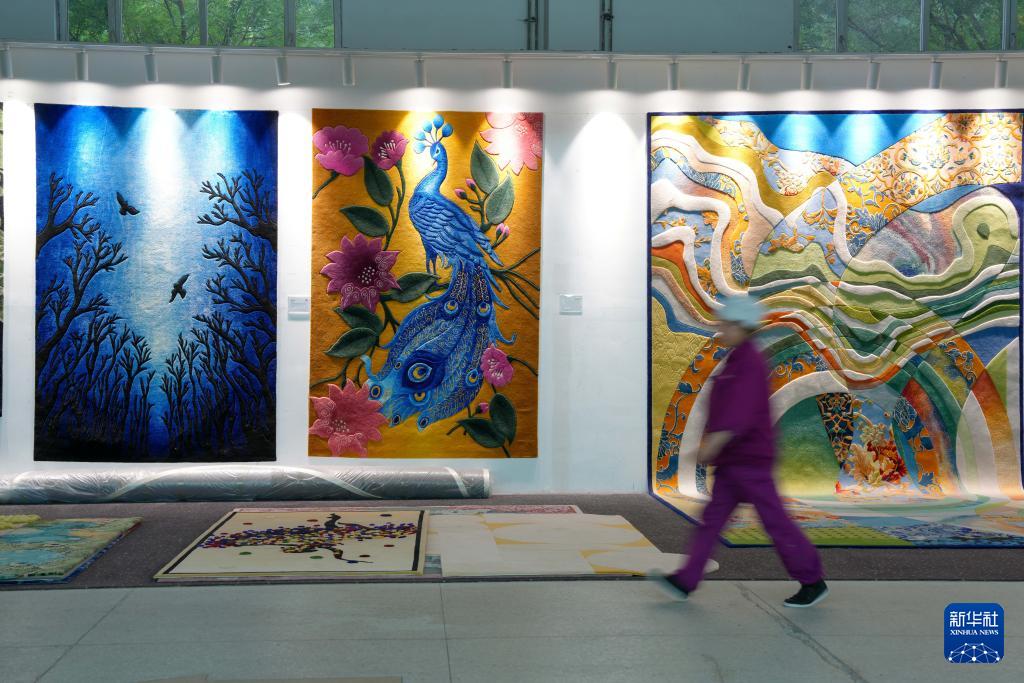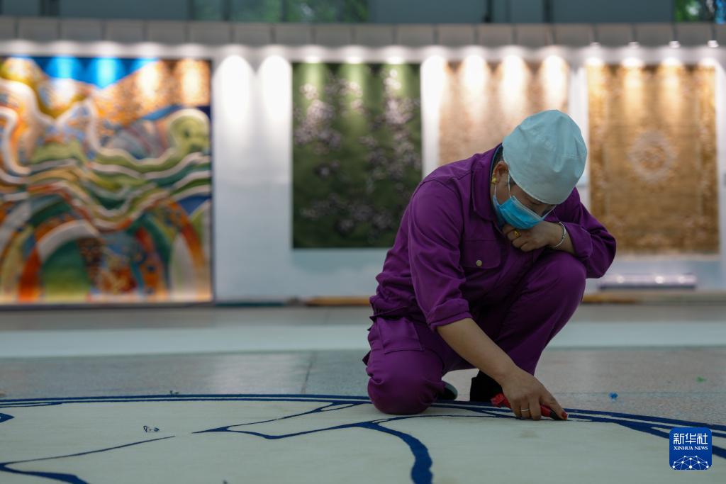 9月27日,在西寧市圣源地毯集團有限公司生產(chǎn)車間,一名操作工從展示的藏毯前走過。新華社記者 杜笑微 攝