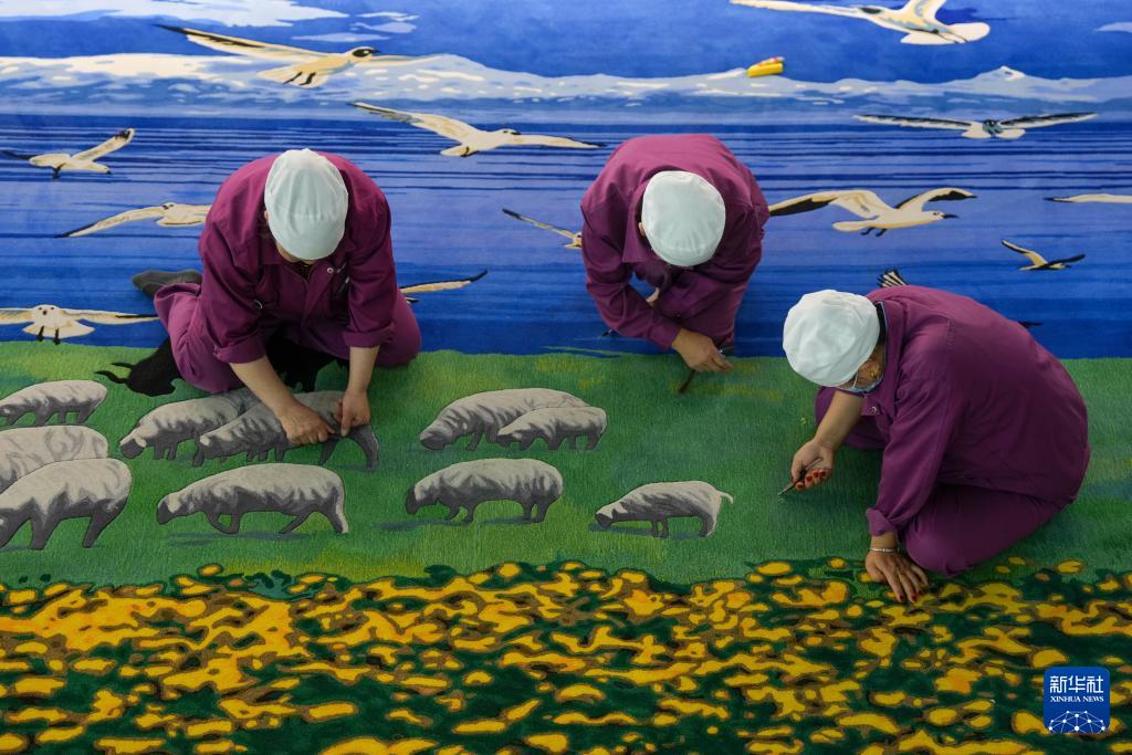 9月27日,在西寧市圣源地毯集團有限公司生產(chǎn)車間,三名操作工在制作藏毯。新華社記者 杜笑微 攝