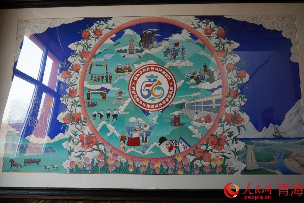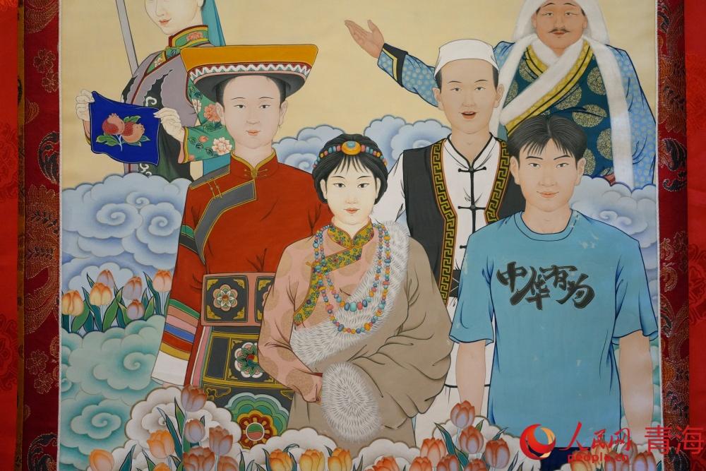 以民族團(tuán)結(jié)為主題的唐卡作品。人民網(wǎng)記者 況玉攝