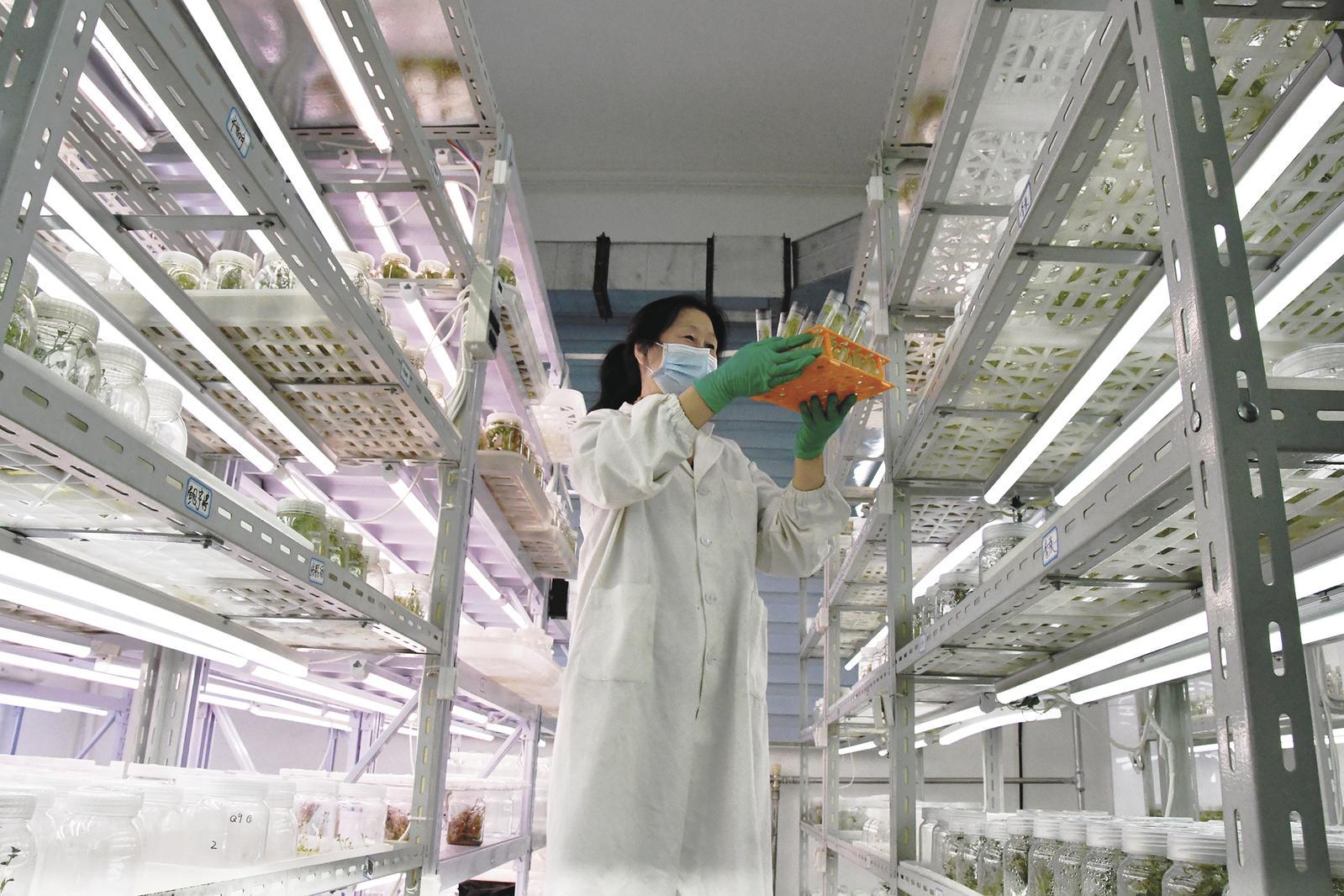 馬鈴薯組培實(shí)驗(yàn)室中,科研人員檢查脫毒苗生長(zhǎng)情況。記者 祁萬(wàn)強(qiáng) 攝