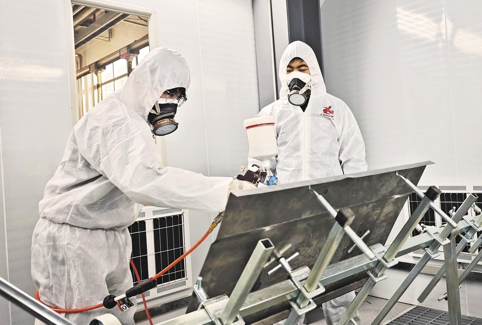 參加省級汽車裝備制造技能大賽賽前訓(xùn)練的學(xué)生正在進行汽車涂裝學(xué)習(xí)。