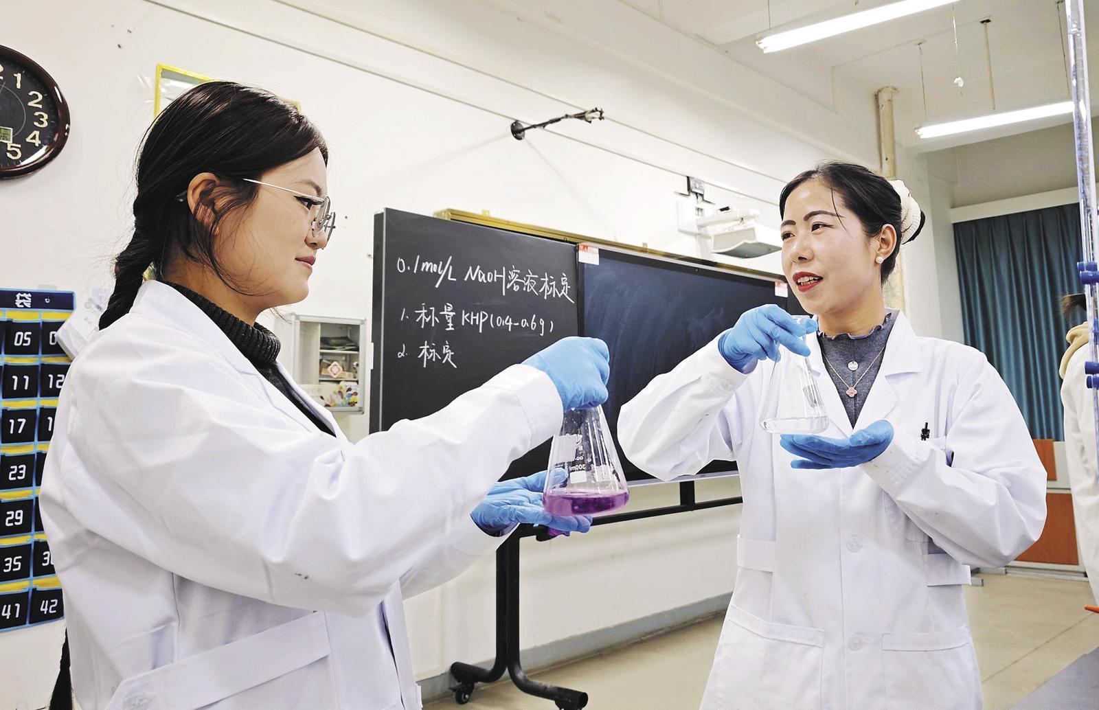 在老師帶領(lǐng)下學(xué)習(xí)化學(xué)分析課程中的氫氧化鈉標定內(nèi)容。