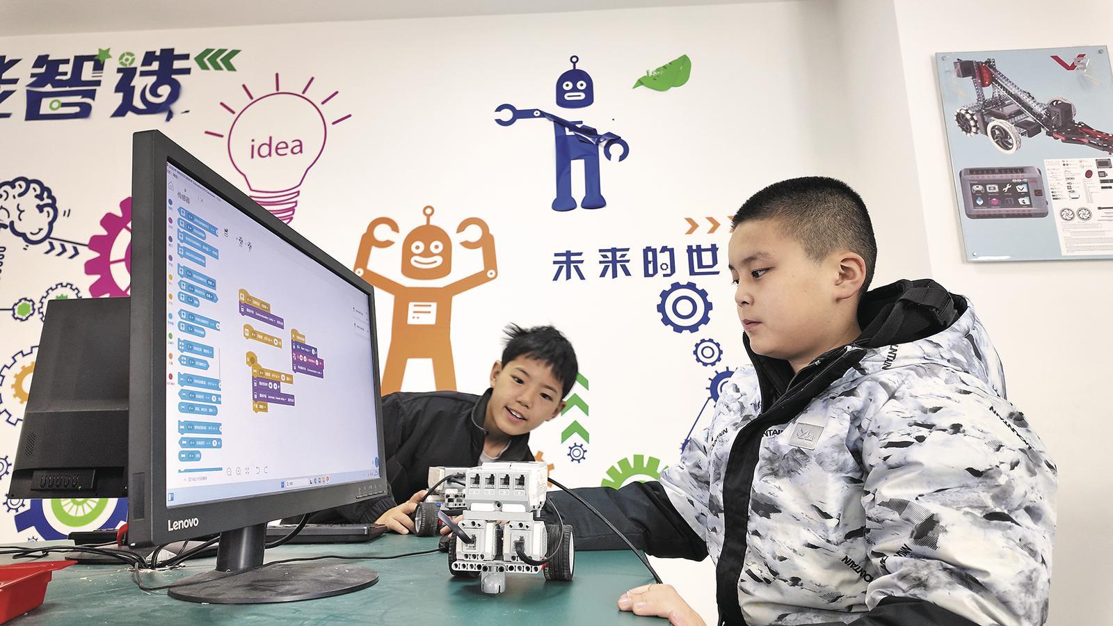 學生體驗機器人編程課的樂趣。