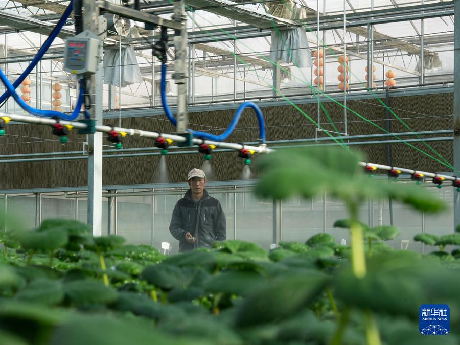 在青海省西寧市湟中區(qū),工作人員正在利用水肥一體化設(shè)備給草莓種苗澆水。新華社記者杜笑微 攝