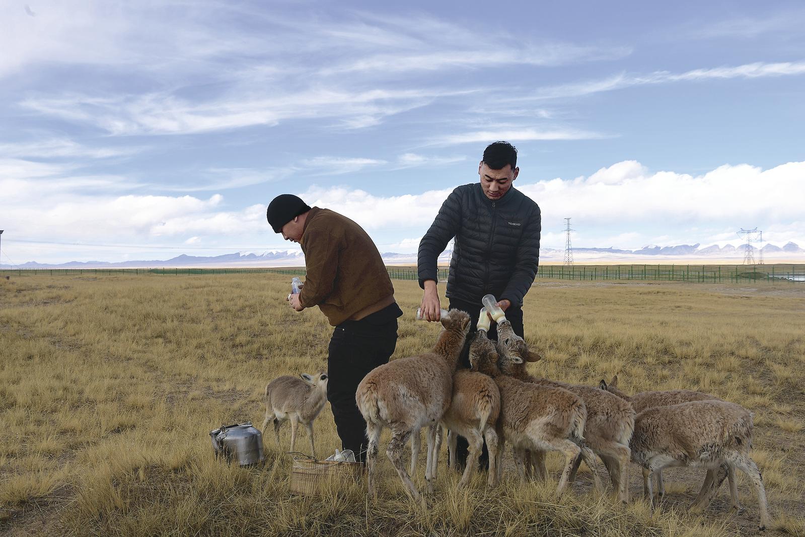 索南達(dá)杰保護(hù)站工作人員喂養(yǎng)救助的小藏羚羊。