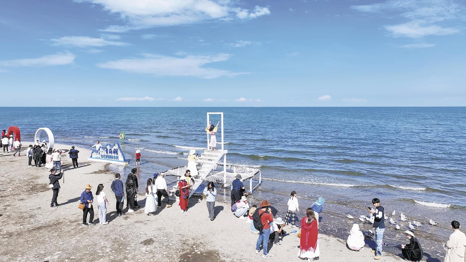 青海湖邊游人正在打卡拍照。記者 張多鈞 攝