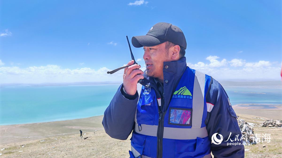 三江源國家公園黃河源園區(qū)的生態(tài)管護員格日杰布在海拔4610米的措哇尕則山頂峰巡護。人民網(wǎng)記者 楊啟紅攝