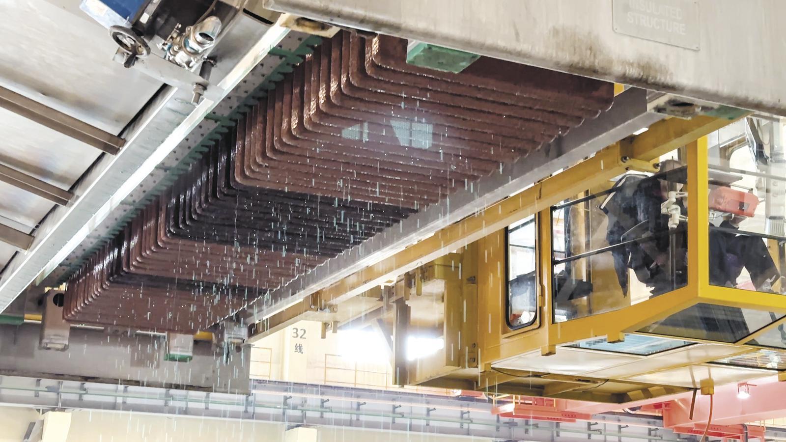 青海銅業(yè)電解車間天車吊起陰極銅。