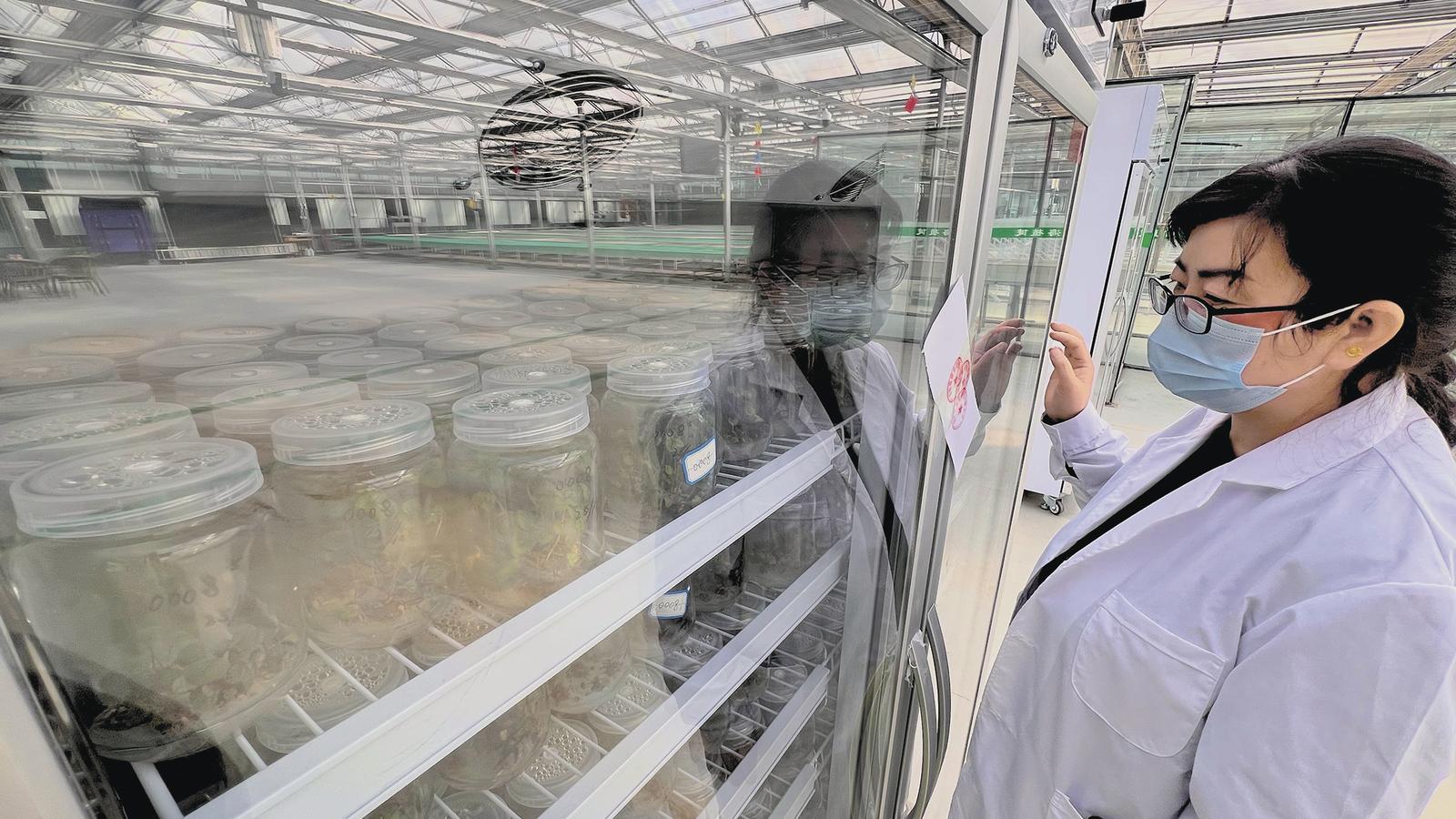 工作人員觀察培養(yǎng)皿中的草莓脫毒育苗長勢情況
