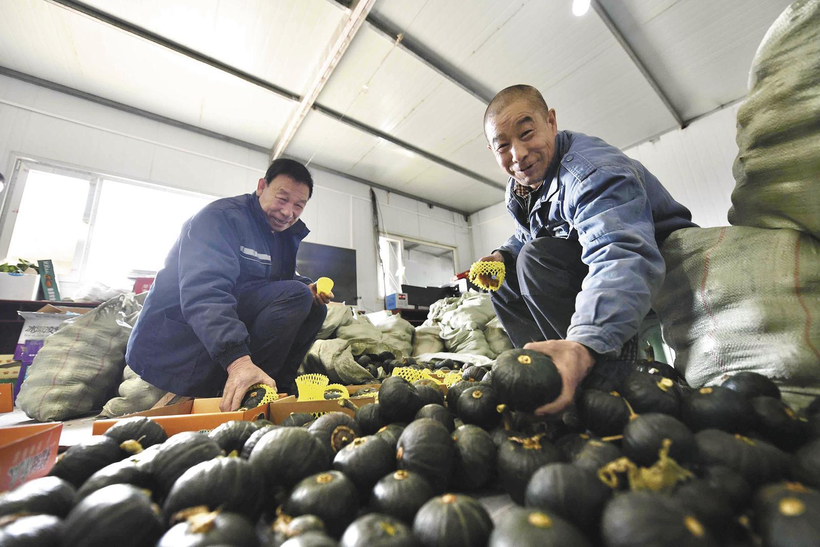 務(wù)工人員將收獲的南瓜進(jìn)行分揀包裝