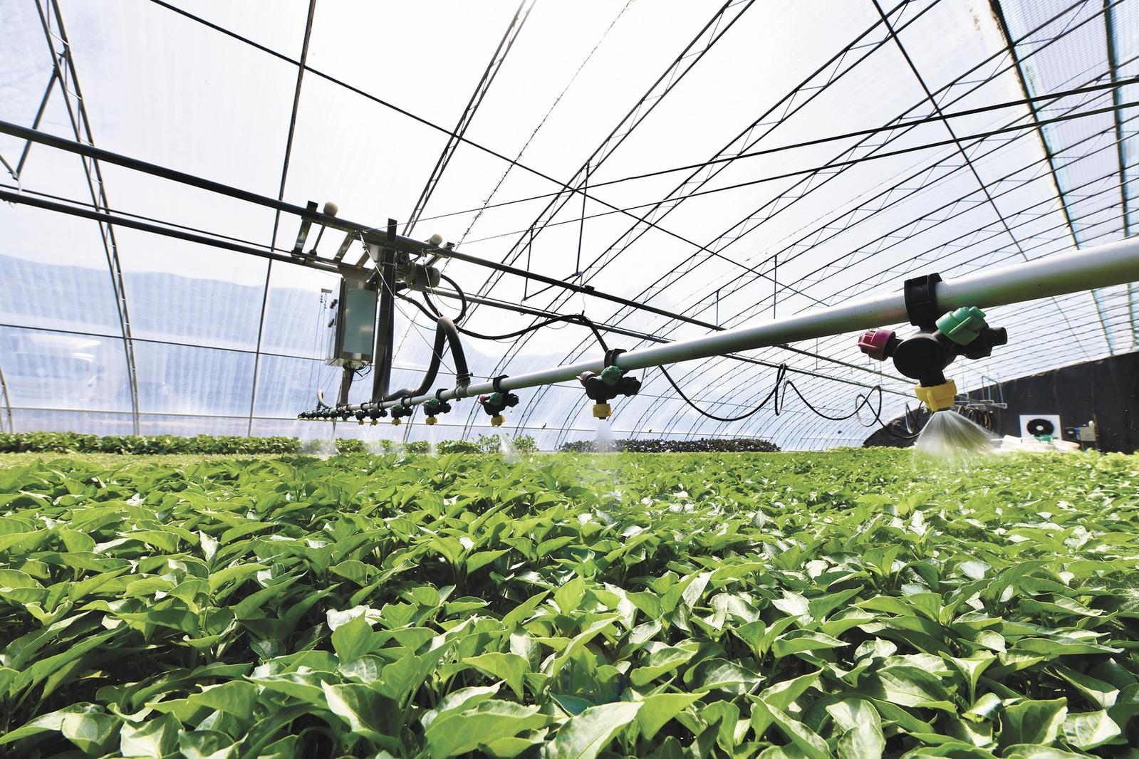 自動化噴灌設(shè)備為大棚里的綠葉蔬菜澆水