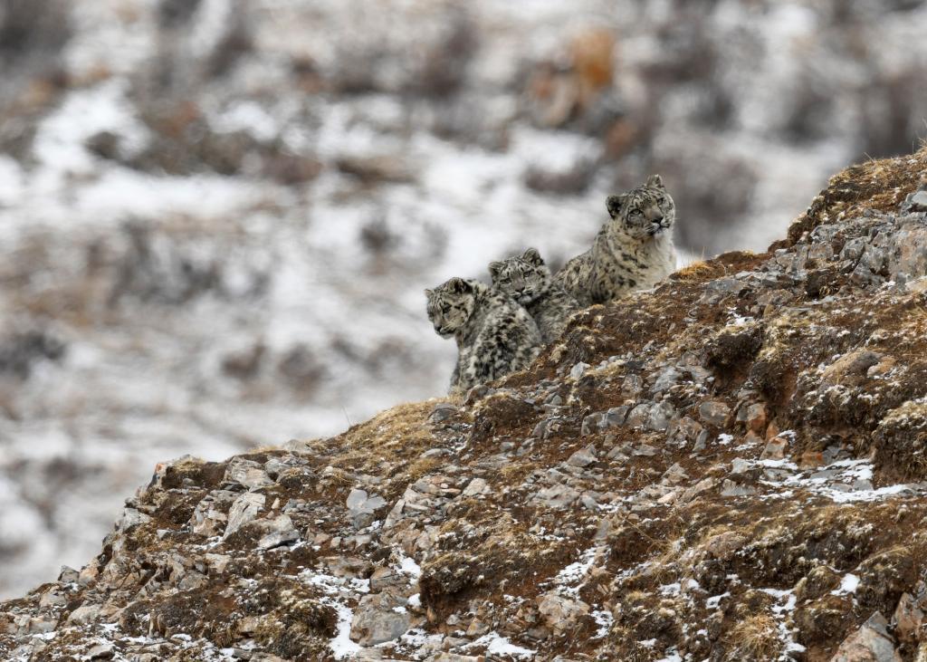 三只雪豹在三江源國家公園內(nèi)棲息。